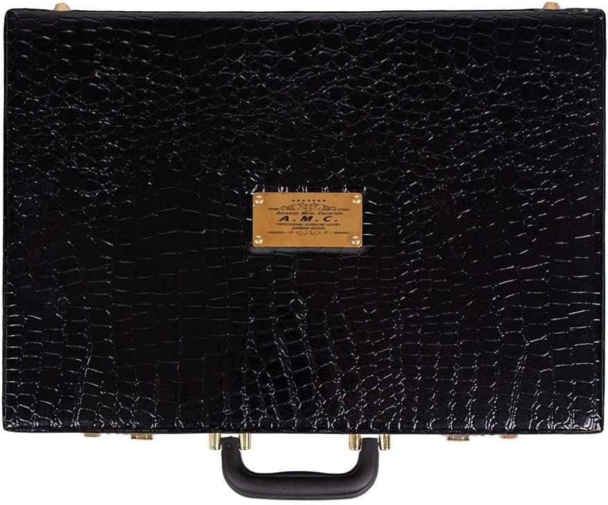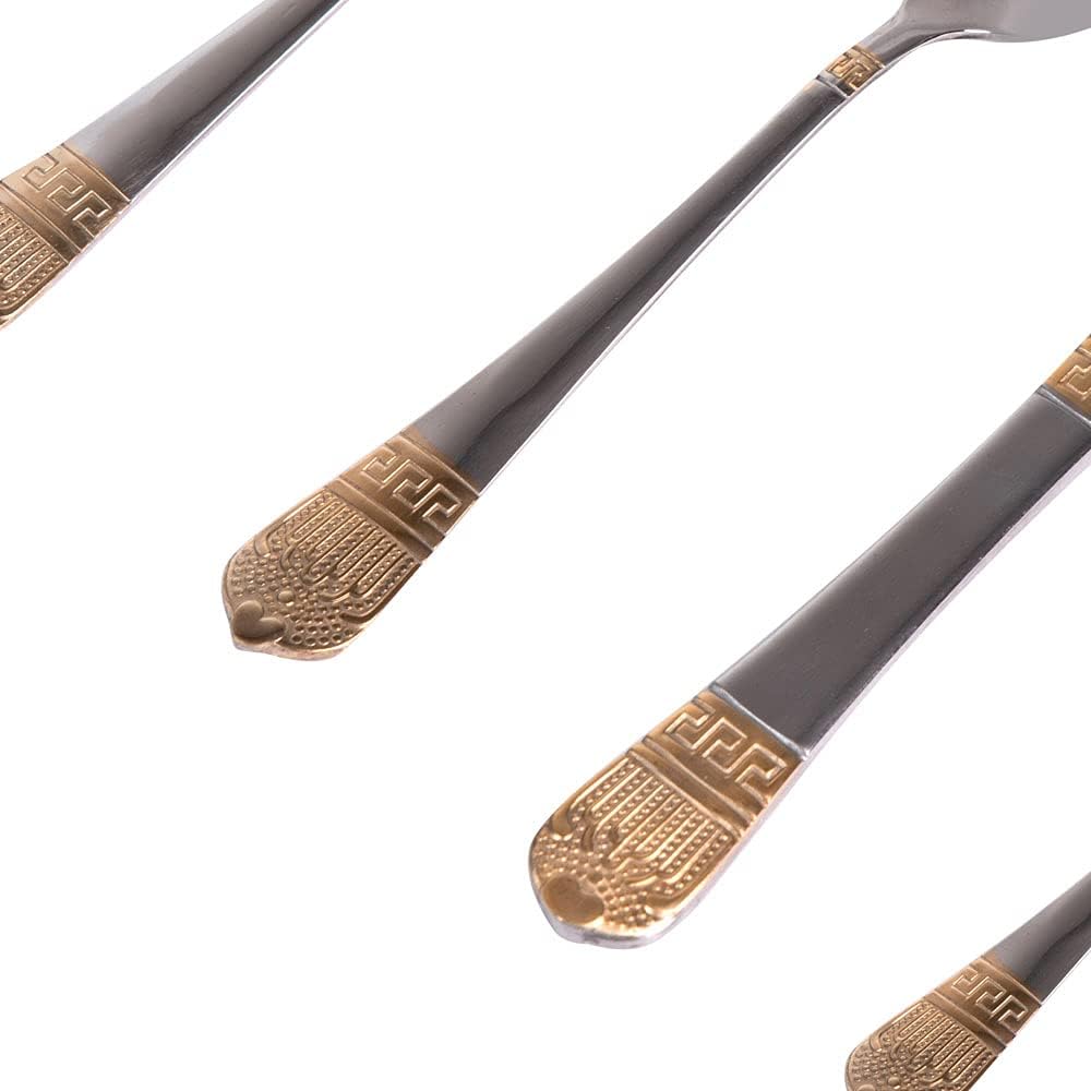 Set di posate ed accessori per 12 persone realizzati in acciaio inox 18/10 lucido con manici decorati con una trama greca in stile luxury